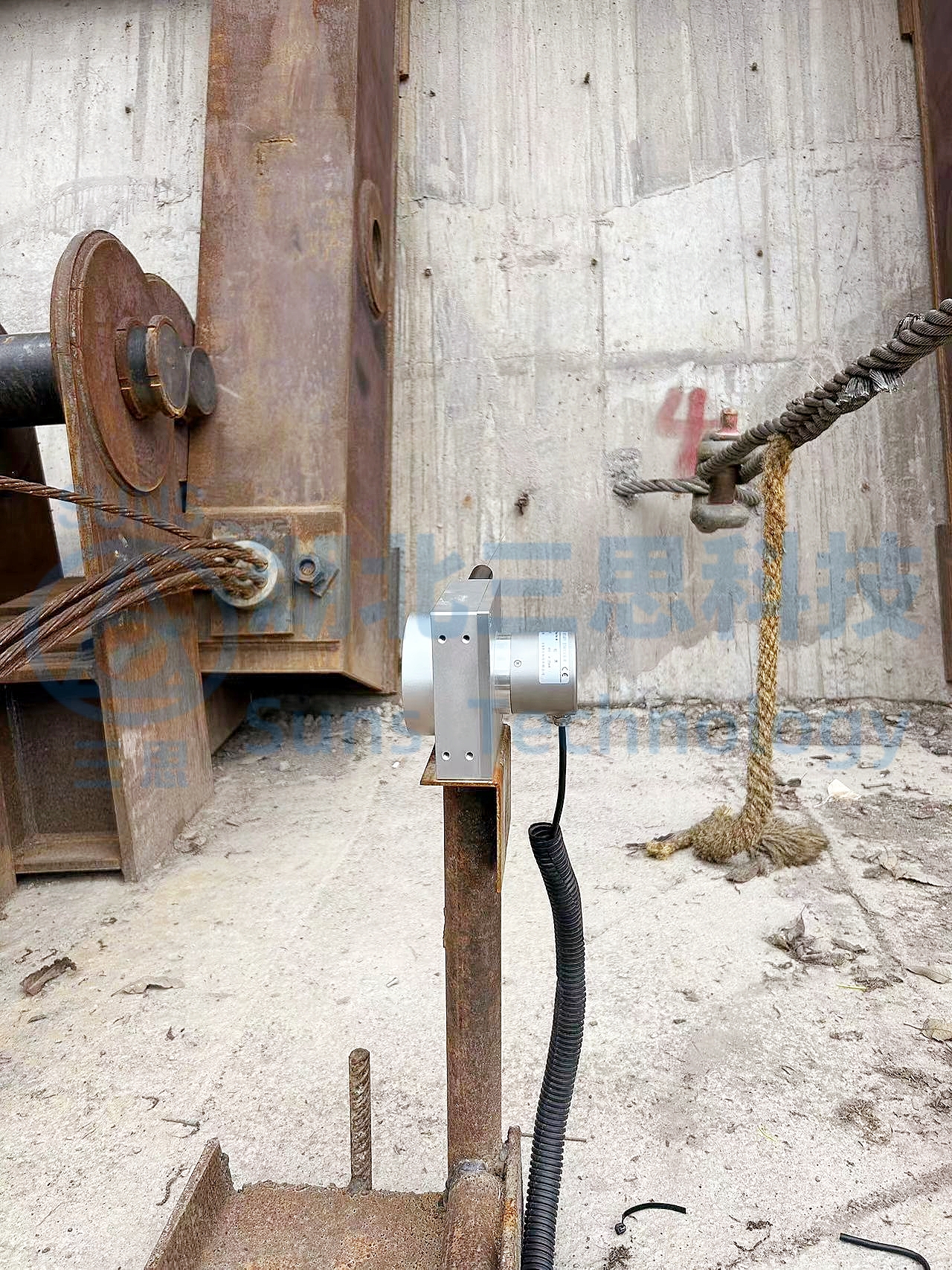 通過在兩岸錨樁位置加裝拉升編碼器,免焊安裝并與錨墩位置固定,通過模擬量信號(hào)傳送至各自的卷揚(yáng)機(jī)處PLC。經(jīng)過系統(tǒng)判斷是否出現(xiàn)錨樁位移現(xiàn)象,輸出信號(hào)給現(xiàn)地操作系統(tǒng),決定是否能夠正常工作。
