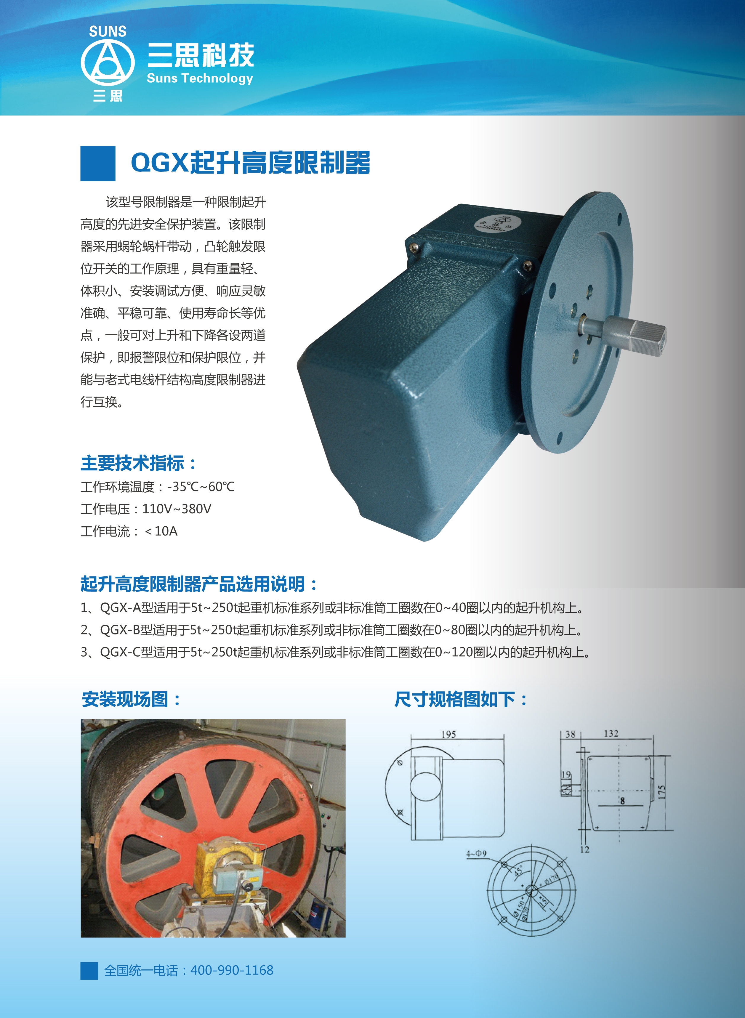 該型號限制器是一種限制起升高度的先進(jìn)安全保護(hù)裝置。該限制器采用蝸輪蝸桿帶動(dòng),凸輪觸發(fā)限位開關(guān)的工作原理,具有重量輕、體積小、安裝調(diào)試方便、響應(yīng)靈敏準(zhǔn)確、平穩(wěn)可靠、使用壽命長等優(yōu)點(diǎn),一般可對上升和下降各設(shè)兩道保護(hù),即報(bào)警限位和保護(hù)限位,并能與老式電線桿結(jié)構(gòu)高度限制器進(jìn)行互換。