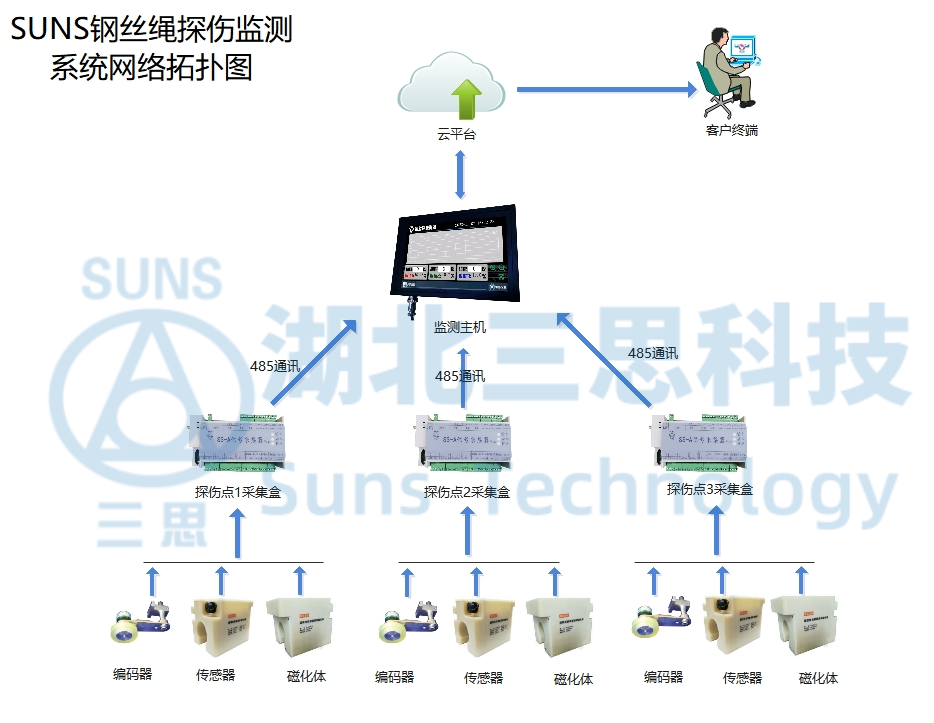 SUNS鋼絲繩探傷監(jiān)測系統(tǒng)由多部分(可選配)軟硬件組成,分別為鋼絲繩探傷傳感器與磁化體、行程編碼器、數(shù)據(jù)監(jiān)測主機(jī)、物聯(lián)云平臺。