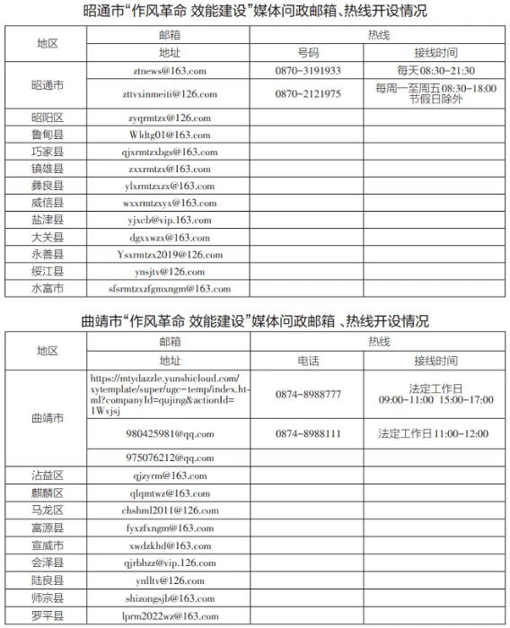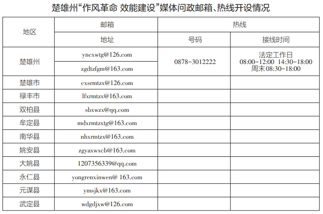 為深入貫徹落實《云南省推進作風革命加強機關效能建設的若干規(guī)定(試行)》,即日起,我省將全面開展“作風革命 效能建設”媒體問政工作。全省各級媒體將面向社會公眾開設“作風革命 效能建設”問政專區(qū),采用電子郵箱、廣播電視專題節(jié)目、熱線電話等多種形式暢通群眾、基層、企業(yè)訴求渠道,廣泛收集各類意見建議,開展輿論監(jiān)督。歡迎廣大群眾、各類企業(yè)就全省各地區(qū)各部門在轉(zhuǎn)變作風、提升效能,服務群眾、服務基層、服務企業(yè)過程中存在的不良現(xiàn)象、典型問題,積極提供相關新聞報道線索。各級媒體將及時把意見建議和問題線索反饋至有關部門,持續(xù)跟蹤問效,推進問題解決。