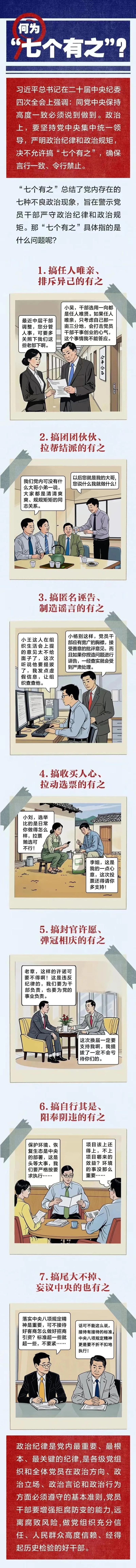“七個(gè)有之”,是習(xí)近平總書(shū)記指出的無(wú)視政治紀(jì)律和政治規(guī)矩的一些突出問(wèn)題,是從無(wú)數(shù)案例中抽象和總結(jié)出來(lái)的,具有極強(qiáng)的現(xiàn)實(shí)針對(duì)性。2021年11月11日,中國(guó)共產(chǎn)黨第十九屆中央委員會(huì)第六次全體會(huì)議通過(guò)的《中共中央關(guān)于黨的百年奮斗重大成就和歷史經(jīng)驗(yàn)的決議》,在第四部分“開(kāi)創(chuàng)中國(guó)特色社會(huì)主義新時(shí)代”中,再次提到了“七個(gè)有之”。習(xí)近平總書(shū)記在二十屆中央紀(jì)委四次全會(huì)上強(qiáng)調(diào):政治上,要堅(jiān)持黨中央集中統(tǒng)一領(lǐng)導(dǎo),嚴(yán)明政治紀(jì)律和政治規(guī)矩,決不允許搞“七個(gè)有之”,確保言行一致、令行禁止。