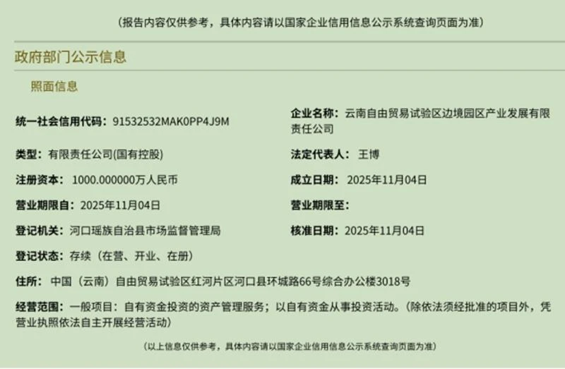 近日,基金公司受托管理的云南自由貿(mào)易試驗區(qū)紅河片區(qū)產(chǎn)融壹號股權(quán)投資基金有限責(zé)任公司(以下簡稱“產(chǎn)融壹號基金公司”)下投云南自由貿(mào)易試驗區(qū)邊境園區(qū)產(chǎn)業(yè)發(fā)展有限責(zé)任公司(以下簡稱“邊境園區(qū)公司”)完成登記設(shè)立。