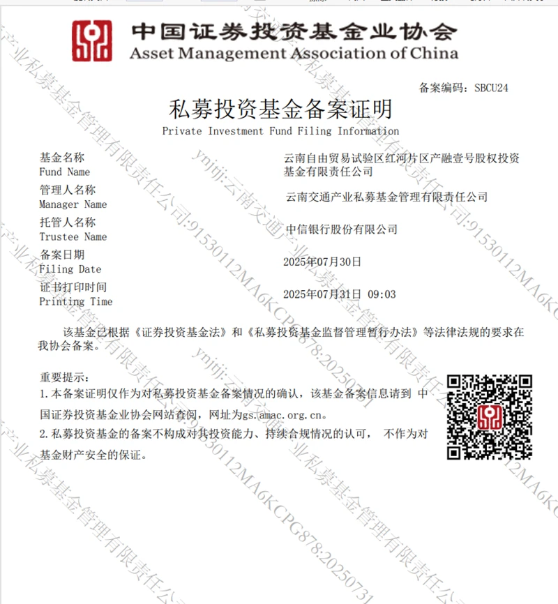 7月30日,基金公司受托管理、募集設(shè)立的首支市場(chǎng)化私募股權(quán)投資基金——云南自由貿(mào)易試驗(yàn)區(qū)紅河片區(qū)產(chǎn)融壹號(hào)股權(quán)投資基金有限責(zé)任公司在中基協(xié)備案成功(備案編碼:SBCU24)。